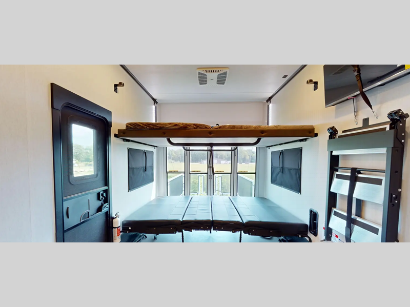 There is a 3,000 lb. rated ramp door on each model, along with DuraPoxy gas/oil resistant flooring, and 5,000 lbs. tie-downs to keep your toys secure on the way to the campground. You can enjoy your toy hauler for years to come thanks to the aluminum frame sidewalls and radius PVC walk-on roof, and the 102" wide body construction will make it easier than ever to load up dirt bikes, four-wheelers, or kayaks! Inside, you'll love the zebra shades in the living areas, the glass shower doors, the quick set garage bed system, and many more comforts!