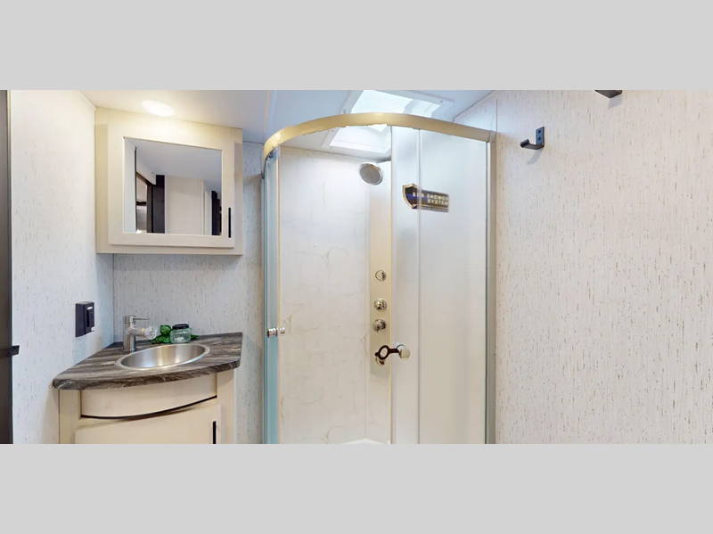 Sleeps 8 Slides 3 Length 44 ft 2 in Ext Width 8 ft 6 in Ext Height 13 ft 4 in Hitch Weight 3050 lbs GVWR 17050 lbs Dry Weight 13564 lbs Cargo Capacity 3486 lbs Fresh Water Capacity 160 gals Grey Water Capacity 80 gals Black Water Capacity 100 gals Tire Size 16" Furnace BTU 35000 btu Fuel Capacity 30 gals Number Of Bunks 1 Available Beds King Refrigerator Type 12V Residential Style Refrigerator Size 17 cu ft Cooktop Burners 3 Number of Awnings 2 Axle Weight 7000 lbs Garage Size 13 ft Water Heater Type Tankless On Demand AC BTU 30000 btu Awning Info 10' and 16' Power w/LED Lights Axle Count 2 Washer/Dryer Available Yes Shower Type Radius Electrical Service 50 amp Similar Floorplans