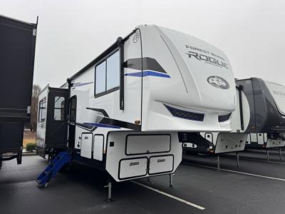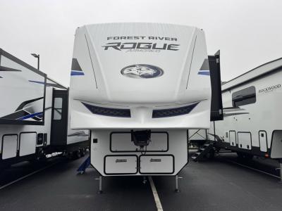 Every one of these Forest River Vengeance Rogue Armored fifth wheel toy haulers come with the features you want most at an affordable price tag! The DuraPoxy gas/oil resistant floor has 5,000 lb. tie downs to ensure your toys will arrive safely without damaging the flooring, plus the 3,000 lb. rated ramp door makes it easy to load them. Two 15,000 BTU A/Cs are "Super H Ducted" to keep you cool even on the hottest summer days, and the heated enclosed holding tanks help protect against the elements. Each model also includes a 6-point leveling system, dual LED cargo lights, solar reflective windows, and a tire pressure monitoring system. Inside, you'll enjoy the solid surface countertops, glass shower door, zebra shades in the living room, and stainless-steel multi-purpose sink to name a few comforts!