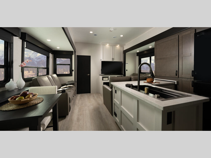 - Core Shield aluminum-framed and vacuum-bonded laminated gel-coated fiberglass exterior walls and slide room end walls