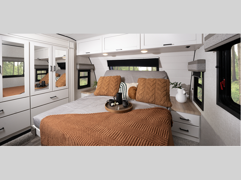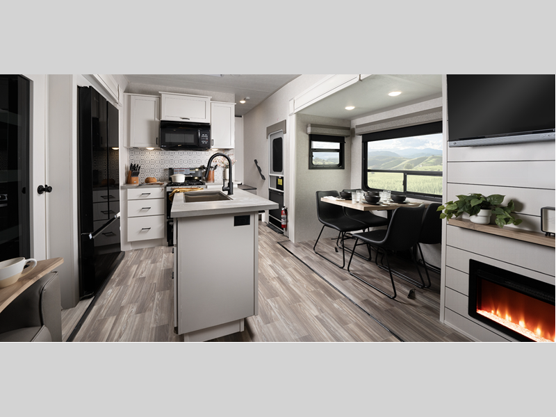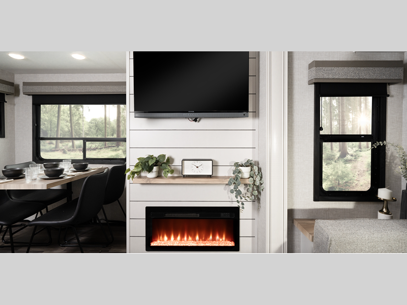 They are set apart from other campers in its class with standard features like the TravelLINK smart RV system, child/pet screen guard on the screen door, and LevelLoc 4 point automatic leveling. Their 100" wide body frame and ACCU-SLIDE slide system opens up the interiors for more interior space. An Equa-Flex axle suspension and self-adjusting electric brakes help you safely arrive to each destination!