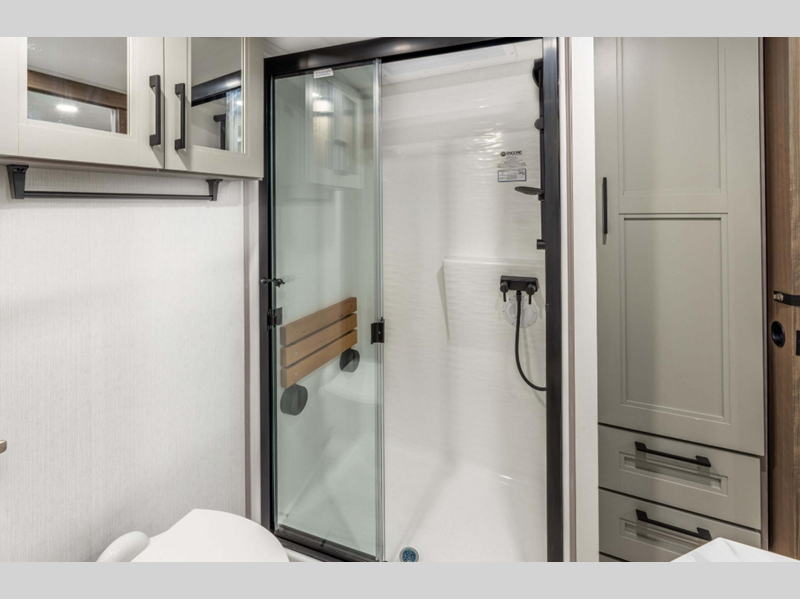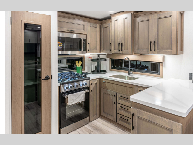 Sleeps 4 Slides 2 Length 33 ft 6 in Ext Width 8 ft Ext Height 12 ft 6 in Interior Color Mink, Pebble Hitch Weight 2070 lbs GVWR 12995 lbs Dry Weight 9910 lbs Cargo Capacity 3085 lbs Fresh Water Capacity 76 gals Grey Water Capacity 90 gals Black Water Capacity 50 gals Tire Size 16" Furnace BTU 35000 btu Available Beds King Refrigerator Type Residential Refrigerator Size 18 cu ft Convection Cooking Yes Cooktop Burners 4 Shower Size 48" x 30" Number of Awnings 1 Axle Weight 7840 lbs LP Tank Capacity 30 lbs Water Heater Type On Demand Tankless AC BTU 15000 btu TV Info LR 50" Smart LED TV Awning Info 20' Power w/LED Light Strip Axle Count 2 Washer/Dryer Available Yes Number of LP Tanks 2 Shower Type Shower w/Seat Electrical Service 50 amp Similar Floorplans