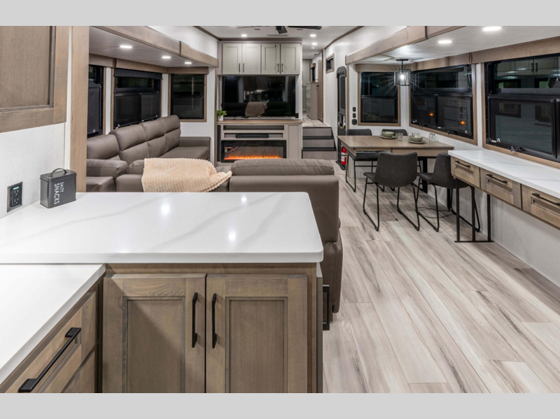 Sleeps 3 Slides 3 Length 37 ft 6 in Ext Width 8 ft Ext Height 12 ft 8 in Interior Color Mink, Pebble Hitch Weight 2190 lbs GVWR 13795 lbs Dry Weight 11770 lbs Cargo Capacity 2025 lbs Fresh Water Capacity 76 gals Grey Water Capacity 90 gals Black Water Capacity 50 gals Tire Size 16" Furnace BTU 35000 btu Available Beds King Refrigerator Type Residential Refrigerator Size 18 cu ft Convection Cooking Yes Cooktop Burners 4 Shower Size 30" x 36" Number of Awnings 1 Axle Weight 9580 lbs LP Tank Capacity 30 lbs Water Heater Type On Demand Tankless AC BTU 15000 btu TV Info LR 65" Smart LED TV Awning Info 16' Power w/LED Light Strip Axle Count 2 Washer/Dryer Available Yes Number of LP Tanks 2 Shower Type Shower w/Seat Electrical Service 50 amp Similar Floorplans